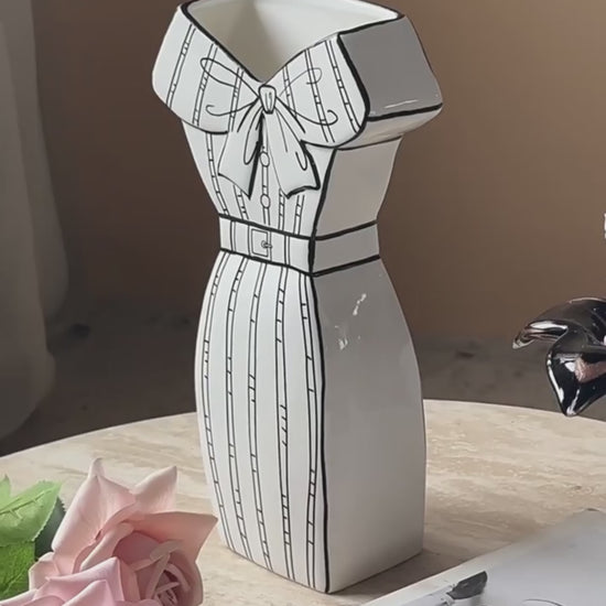 Charming and unique, this ceramic vase is shaped like a little white dress tied with a ribbon – hand-painted with fine black lines for a modern-meets-vintage appeal. It’s a delicate yet bold way to display flowers, enhance your table decor, or surprise someone with an artful gift. Perfect for romantic, feminine, or Parisian-inspired interiors.