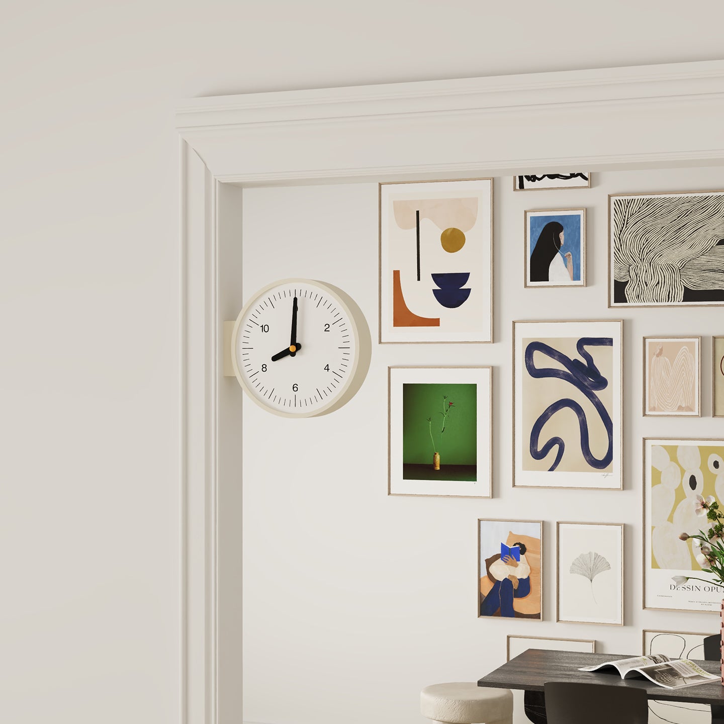 Turn any corner into a statement with this double-sided wall clock designed for both form and function. Featuring a clean, retro-inspired look with minimalist dot or numeral dials, this clock brings a gallery-worthy aesthetic to any doorway, hallway, or reading nook.