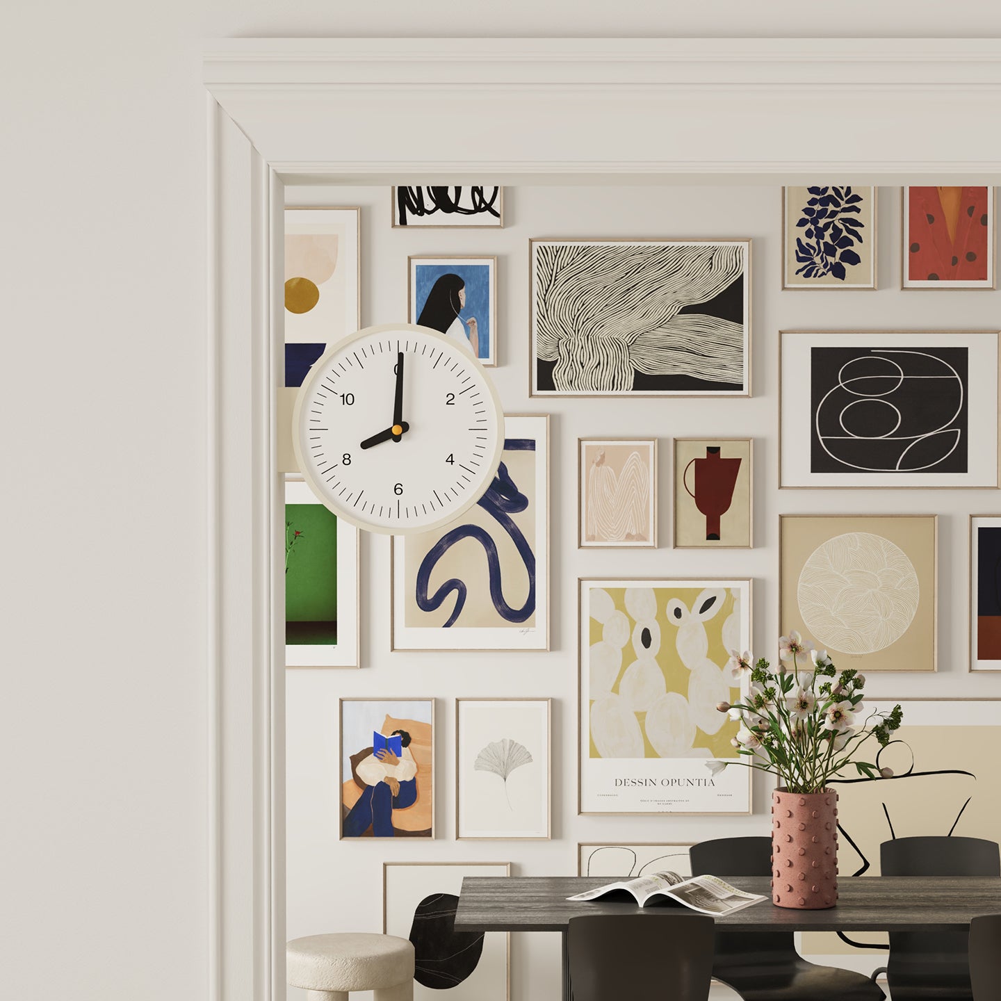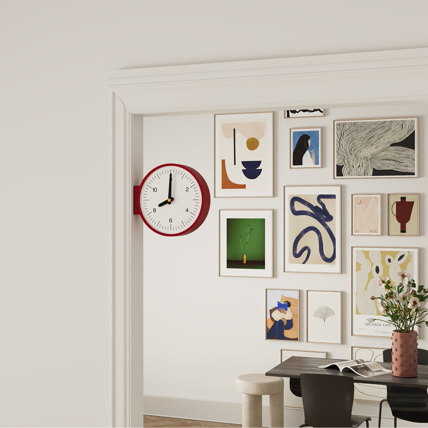 Its unique corner-mount design offers time visibility from both sides, making it ideal for open-plan spaces or transitional areas. Whether hung on the wall or placed upright on a tabletop, its playful yet practical design fits effortlessly into modern, creative interiors. The silent quartz mechanism ensures a calm, tick-free environment.