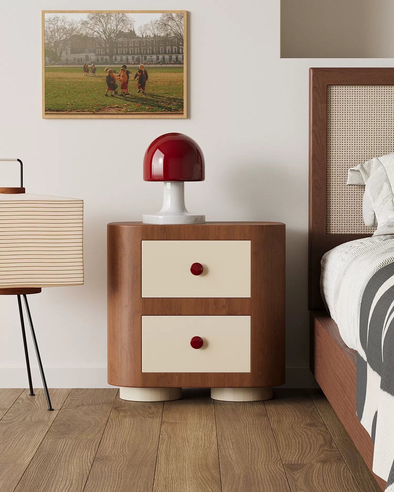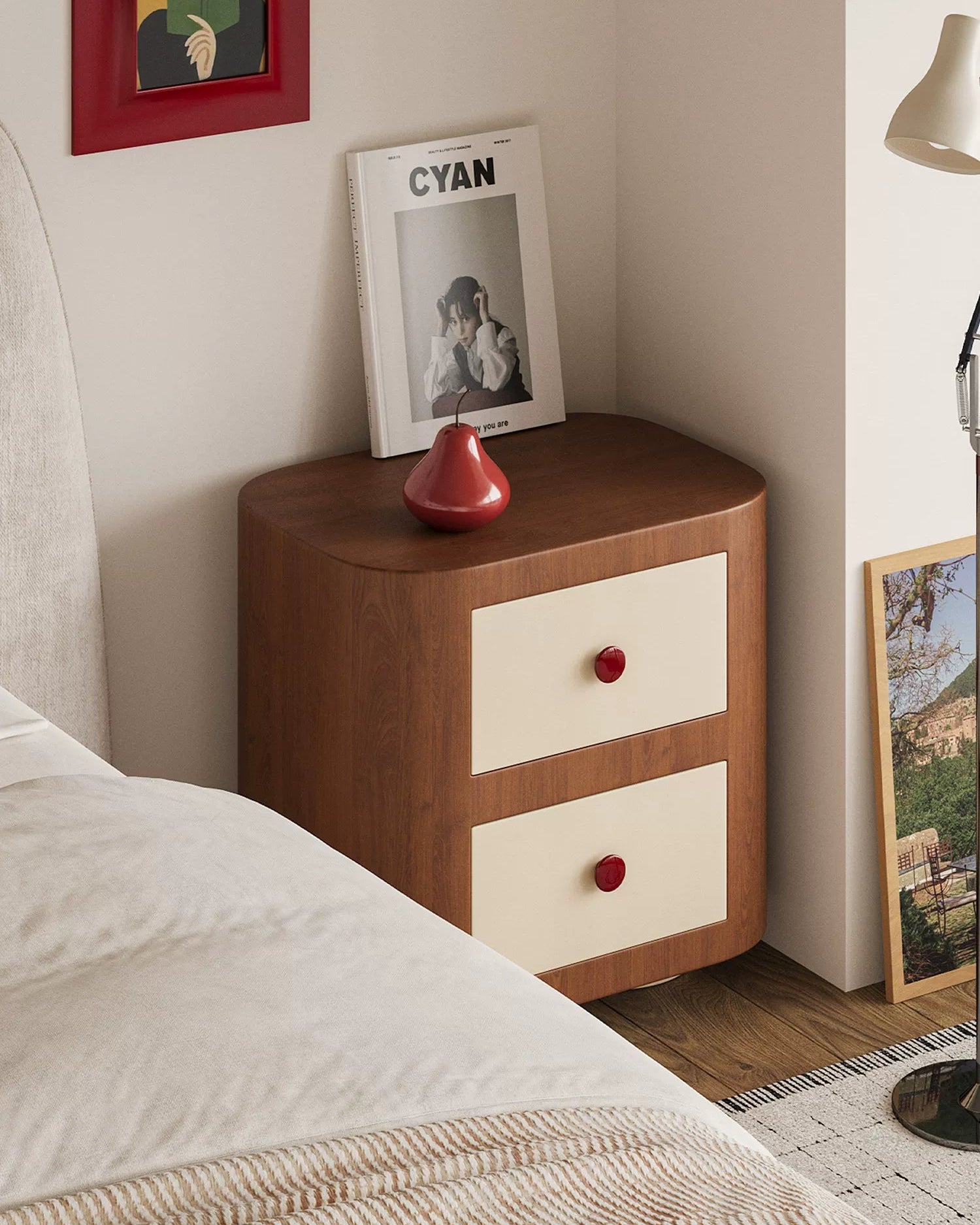 Bring playful vintage charm into your bedroom with the Pinocchio Retro Bedside Cabinet. Inspired by mid-century design with a cute, rounded silhouette, this two-drawer nightstand combines warm wood tones with creamy drawer fronts and cherry-red knobs for a cheerful yet refined look. Compact but practical, it’s perfect for bedside storage, small apartments, or adding a statement piece to a cozy corner.