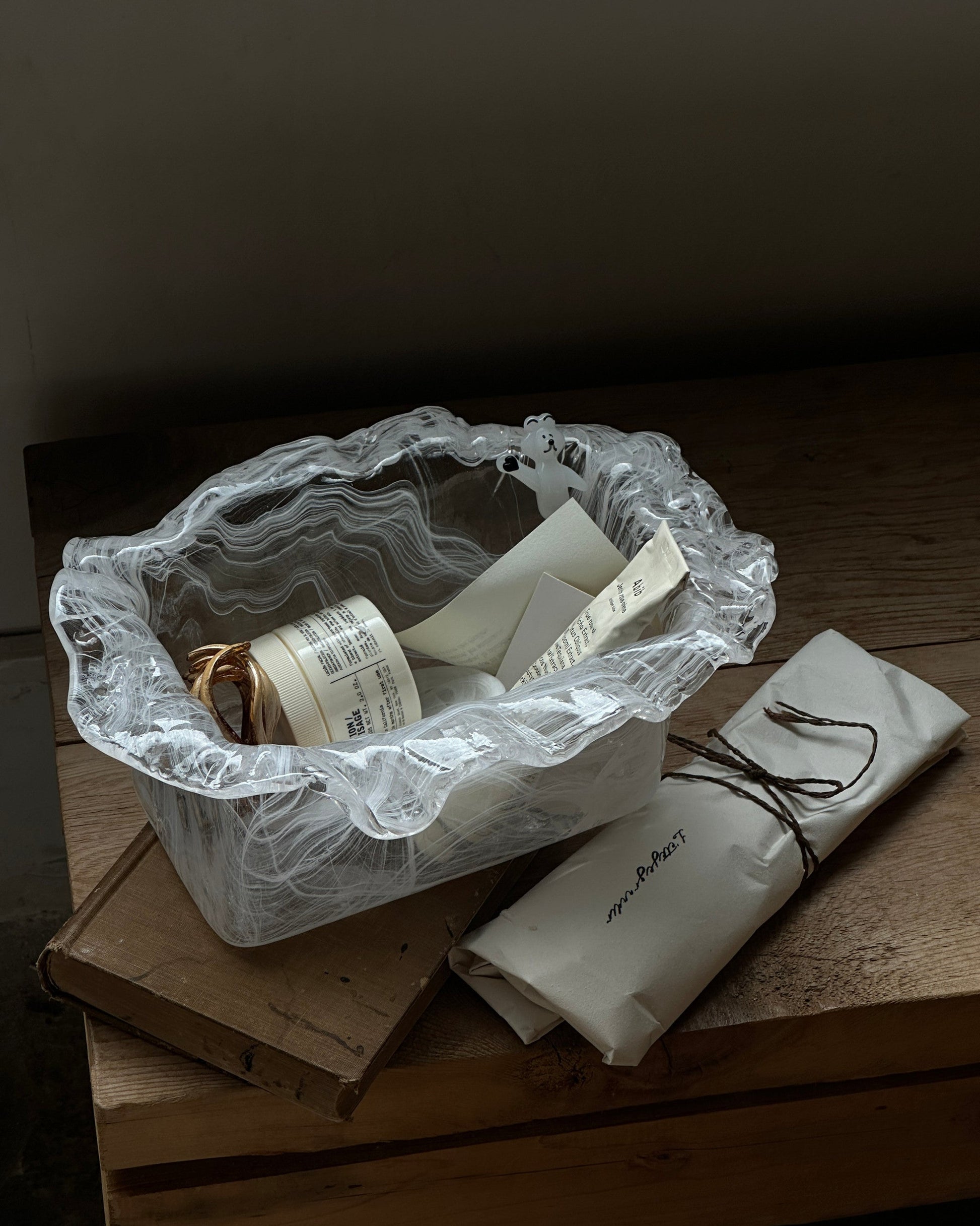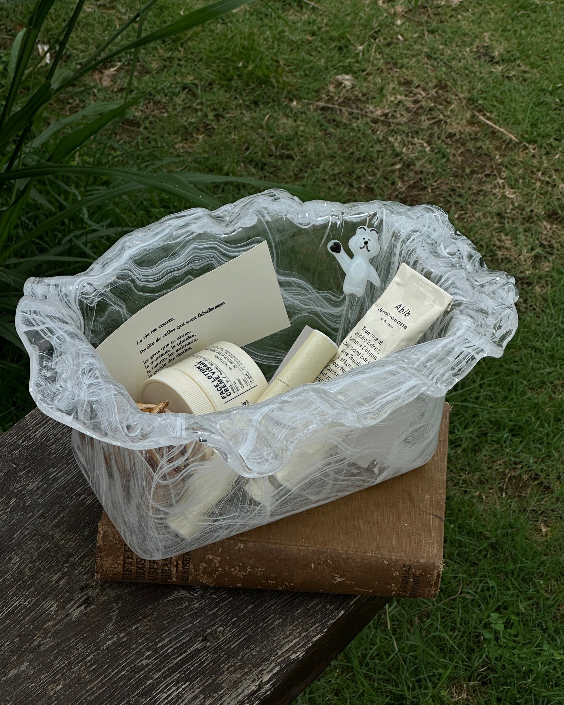 Elevate your storage game with the Smoky Storage Bowl — a sculptural glass container that blends practicality with poetic design. Crafted from textured, semi-translucent glass, its flowing, cloud-like patterns give a dreamlike aura to any surface. Whether used for organizing skincare essentials, desk accessories, or simply as a standalone decor piece, this bowl adds elegance and intrigue. The wavy rim and misty finish make it an eye-catching accent for bathrooms, vanities, or modern living rooms.